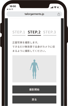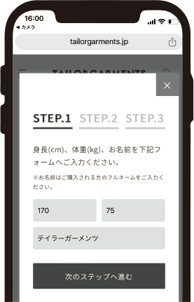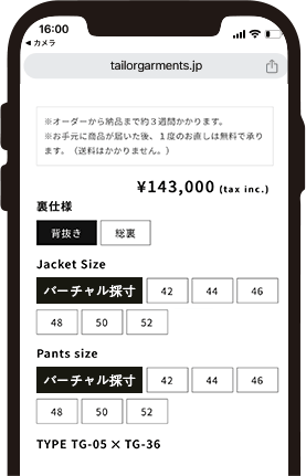TAILORGARMENTSオンラインショップでは、バーチャル採寸によるオーダーが可能です。