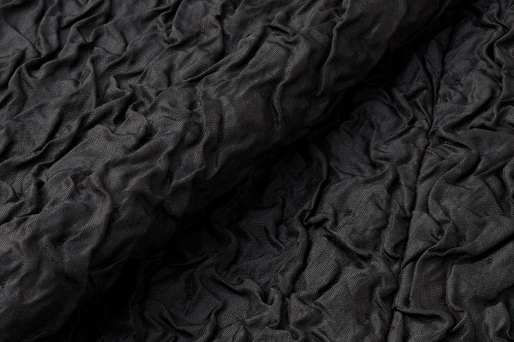光沢感が強く出るよう紡糸されたポリエステル糸を使用し織られた、存在感のある生地。一見ランダムに配されたような凹凸は、他の柄とバッティングしにくいように計算されたものになっています。