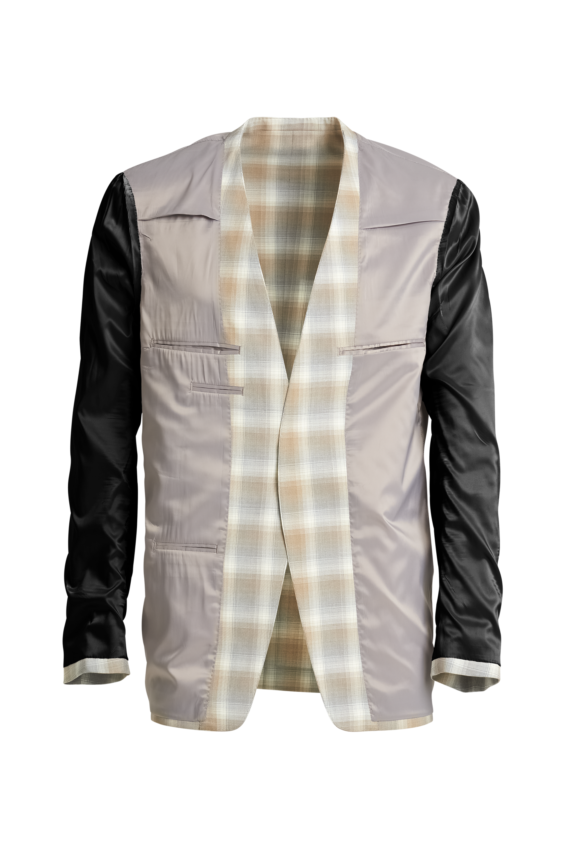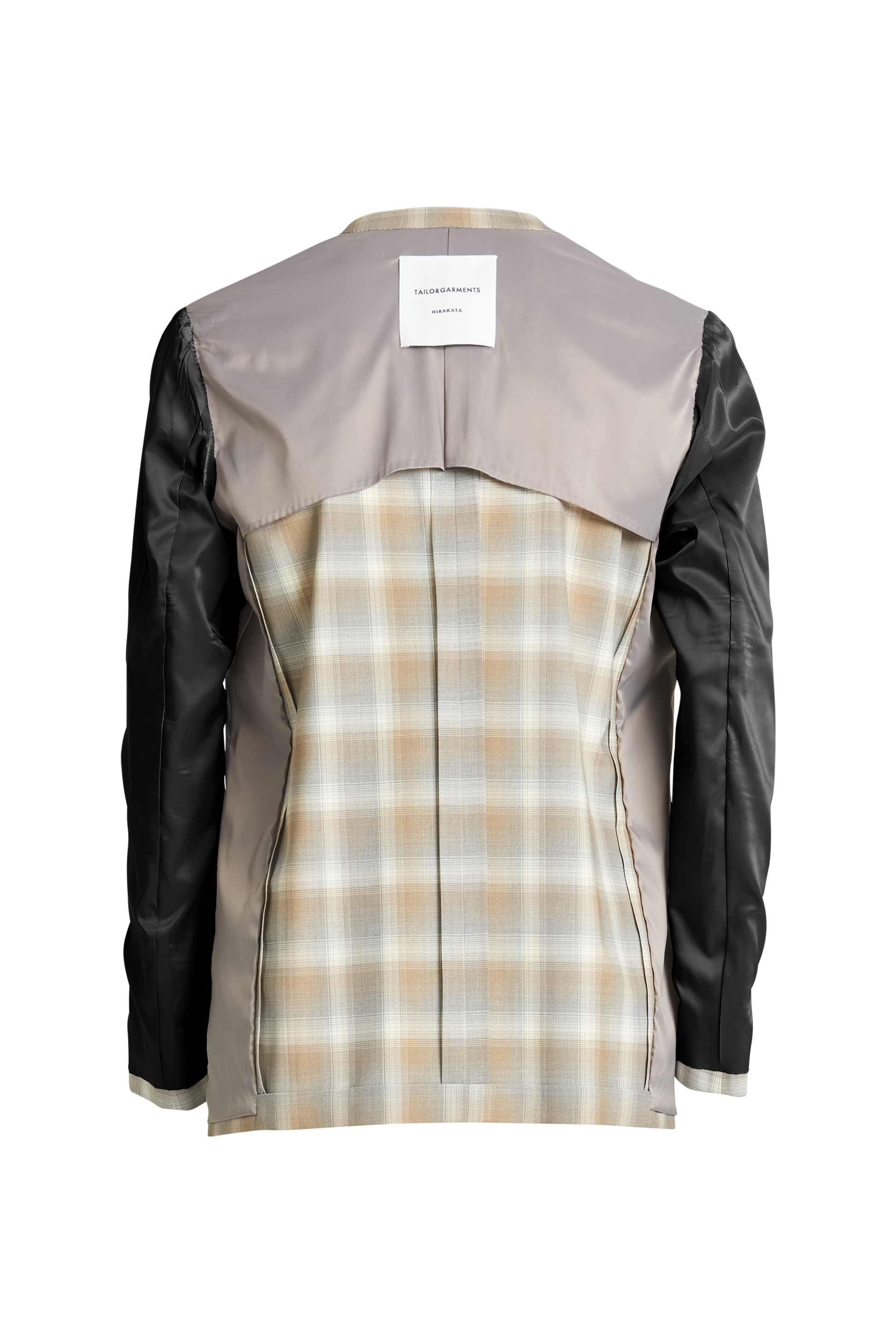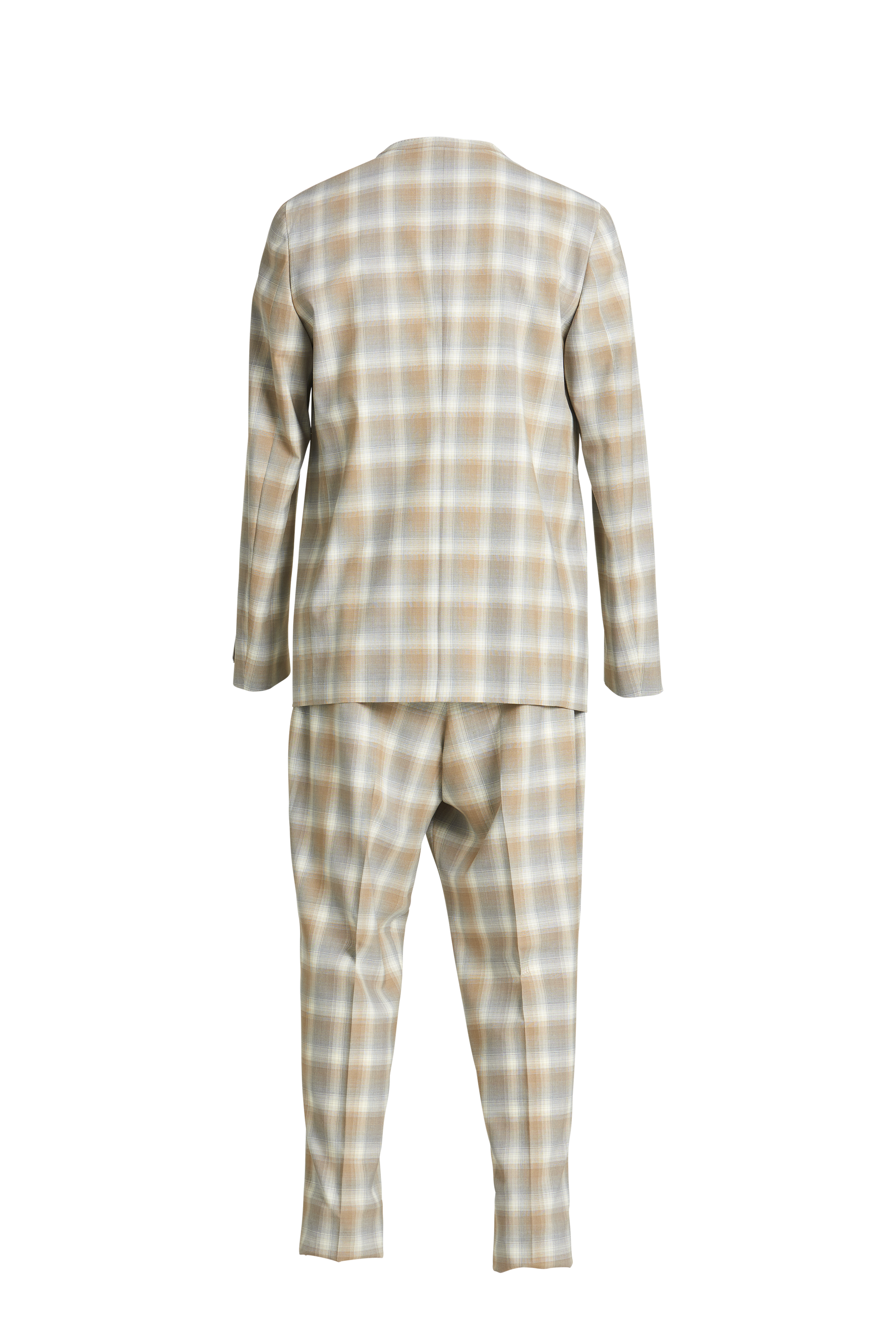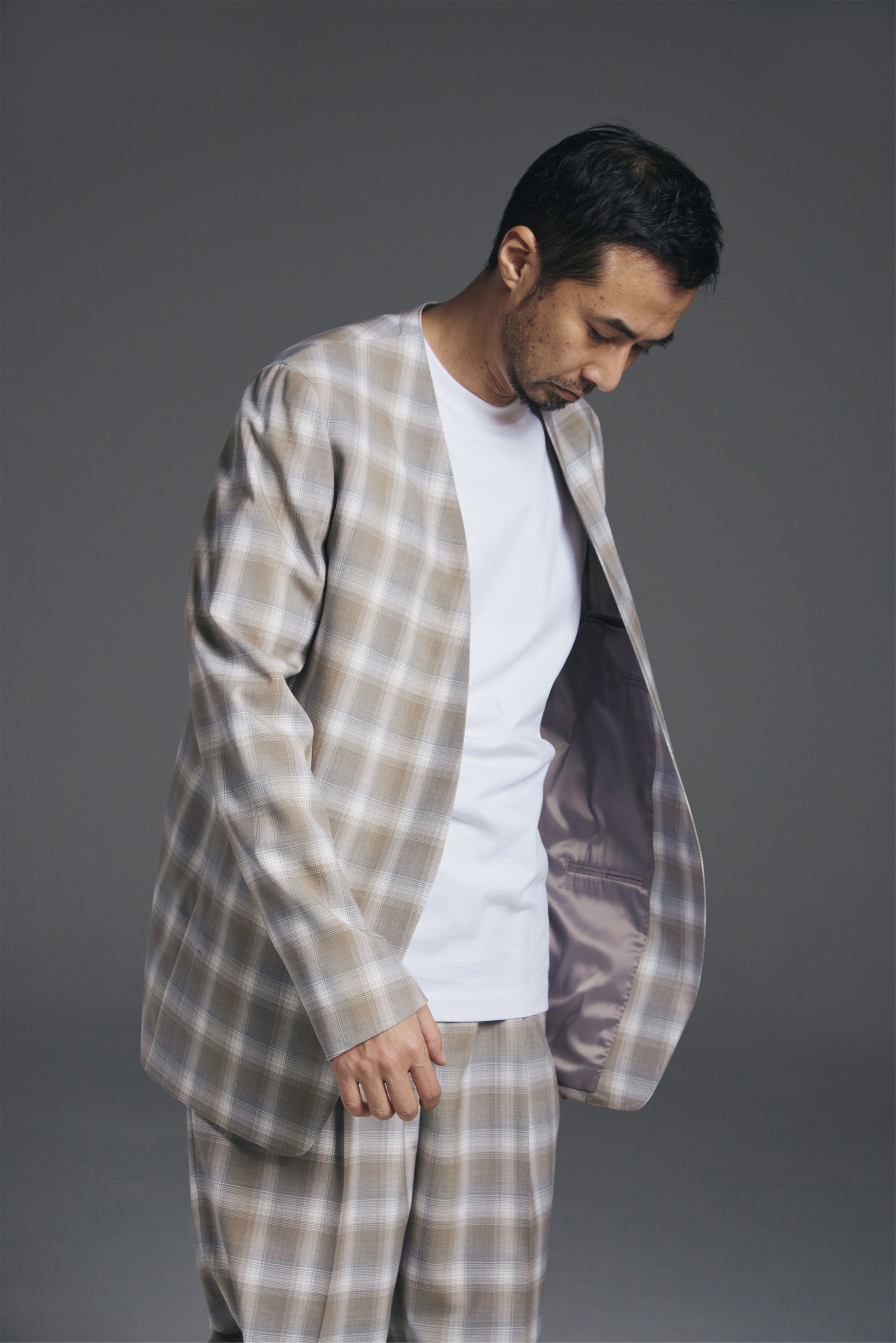 ボタンレスのノーカラージャケットにハイウエストのバルーンパンツという、これまでにないスーチングスタイルを楽しんでいただけるセット、生地も春夏らしい柔らかなトーンのチェックをチョイスしました。