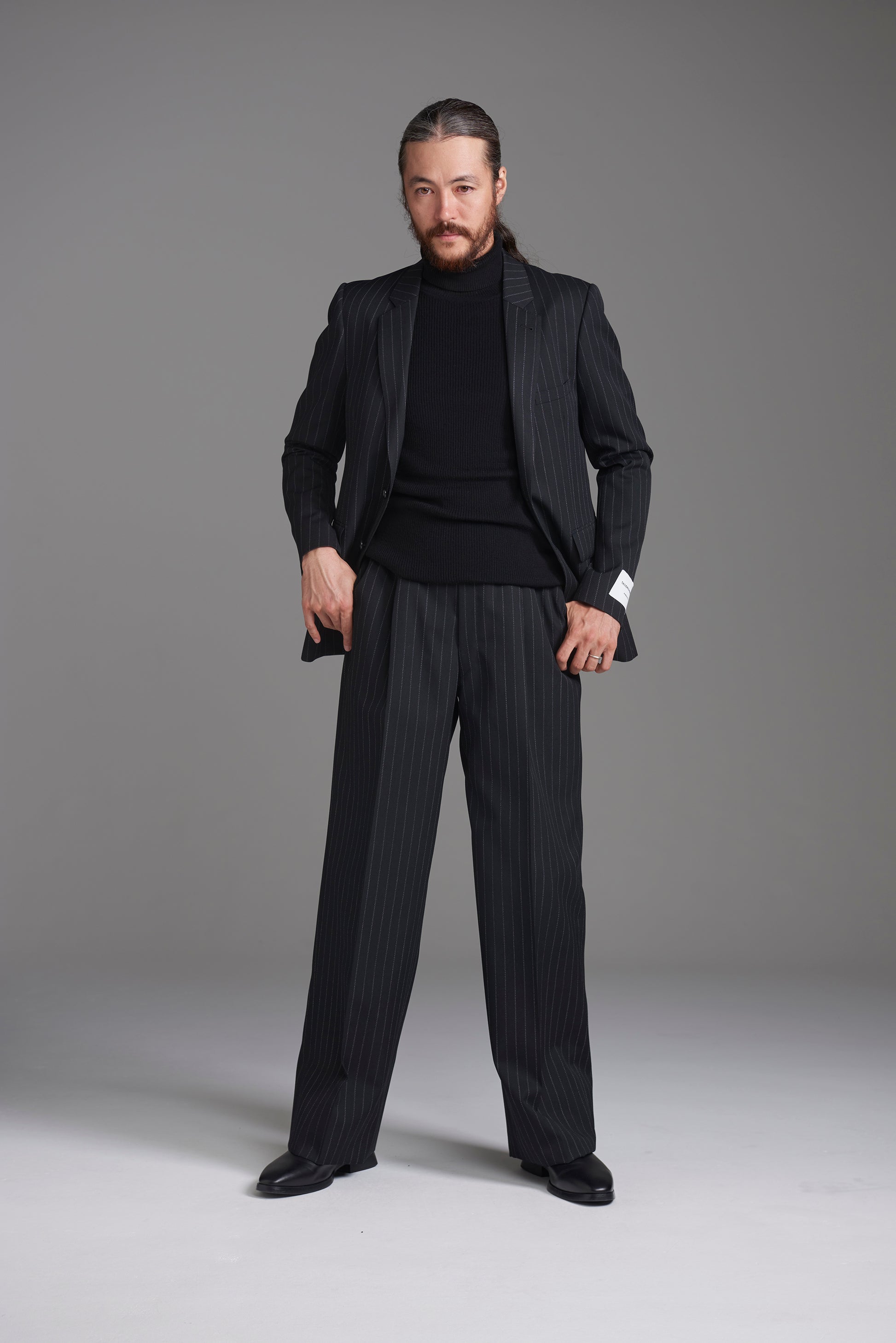 かすれ調のストライプを、ボトムのデザインが楽しめる2つボタンのショート丈ジャケットとワイドパンツのデザインで。