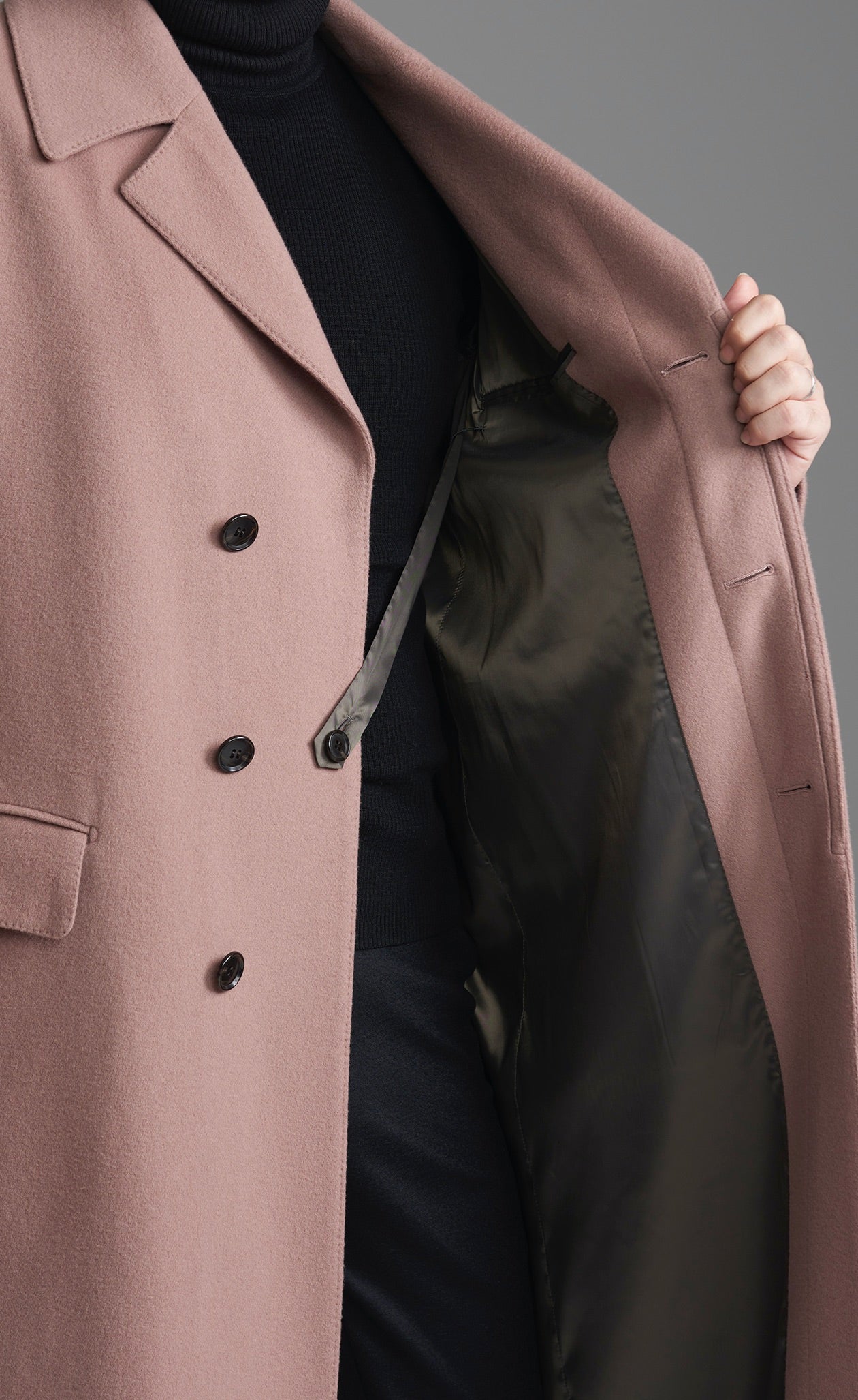 ボリュームとドレープ感が楽しめる、ロングの着丈のバルマカーンタイプのコートです。前合わせはシングルより深く、ダブルに近いデザイン。フロントのボリューム感も豊かです。