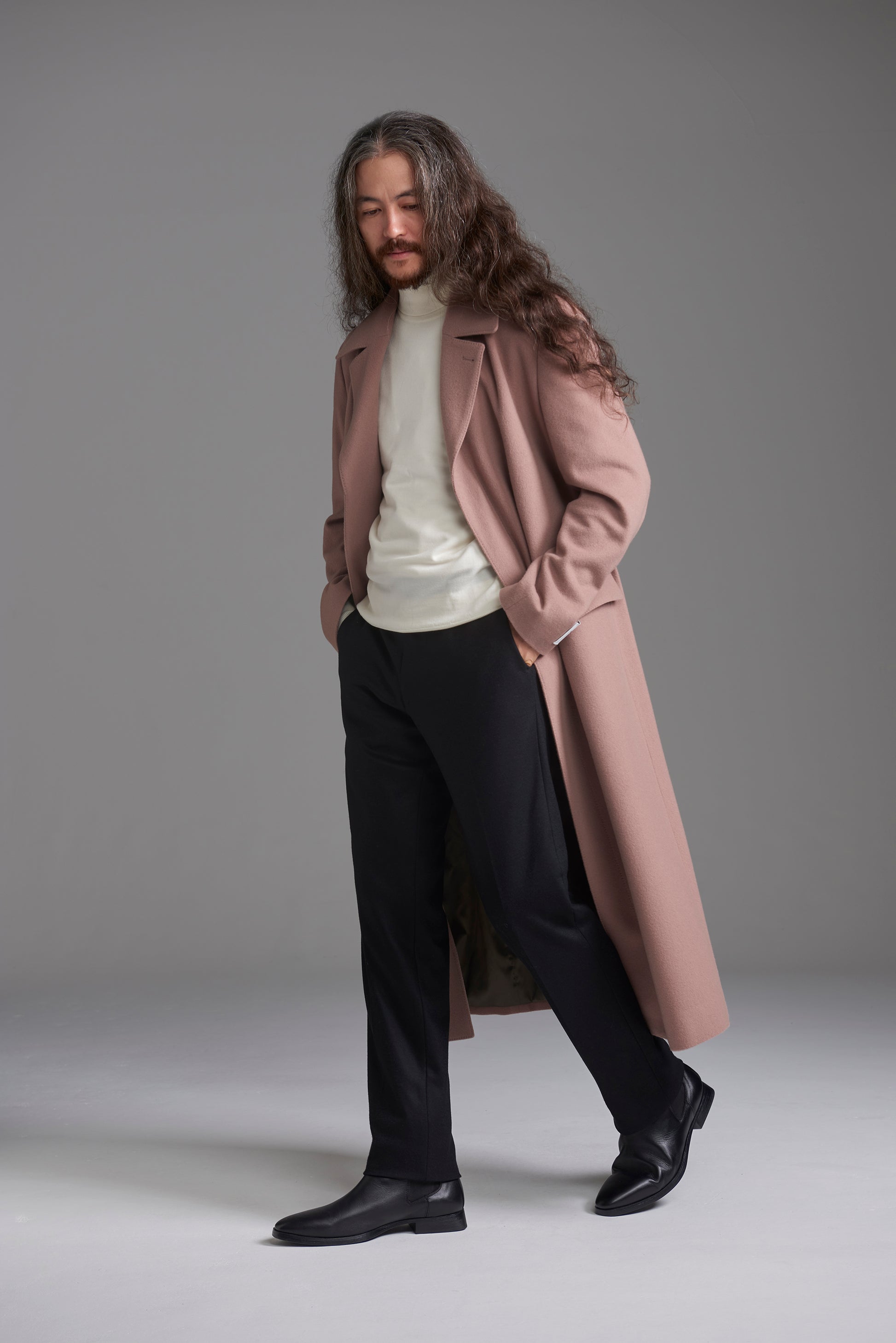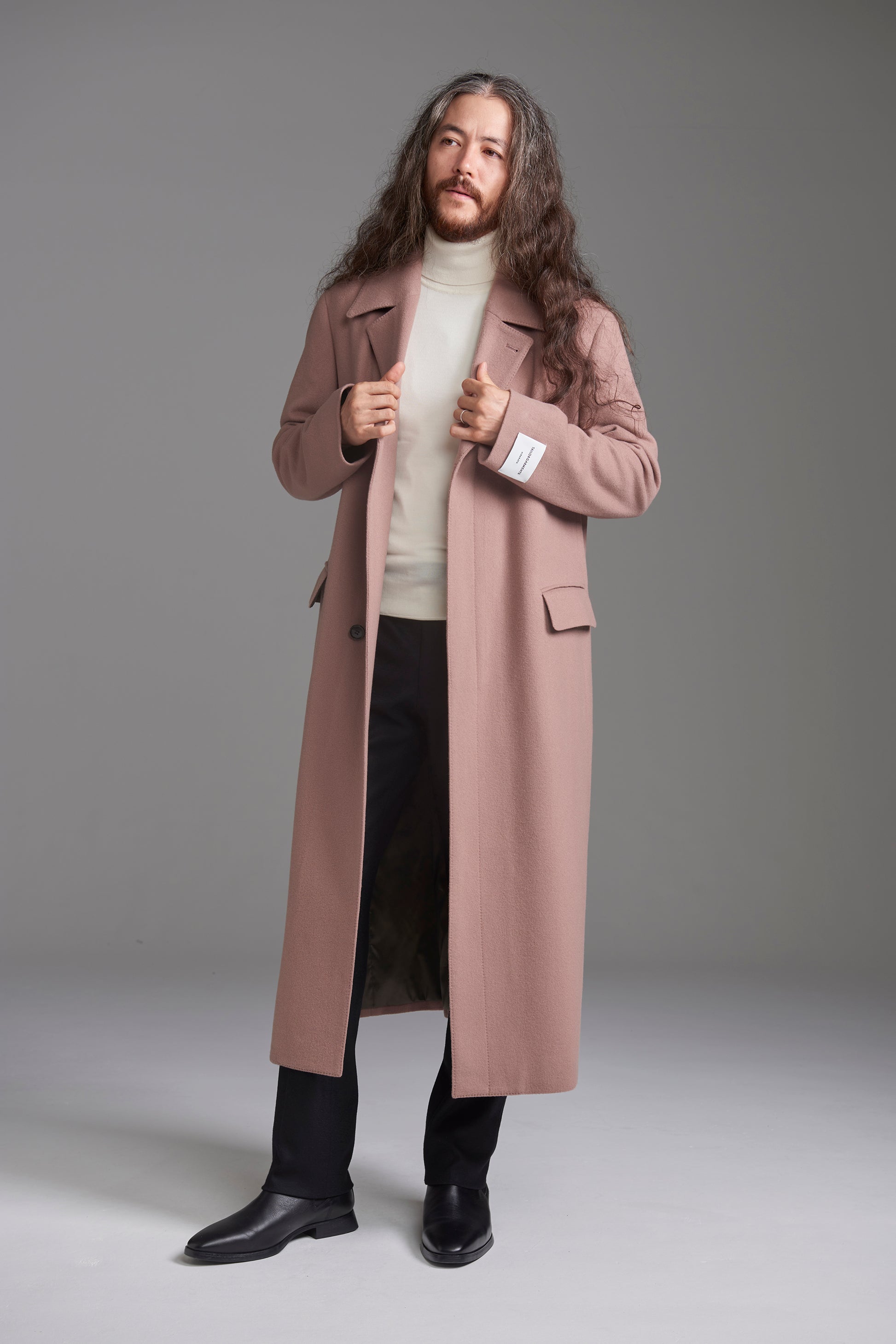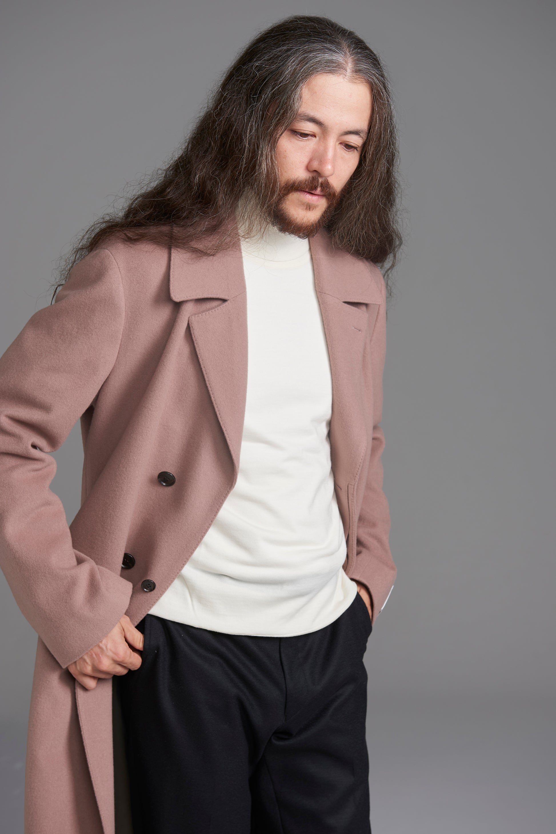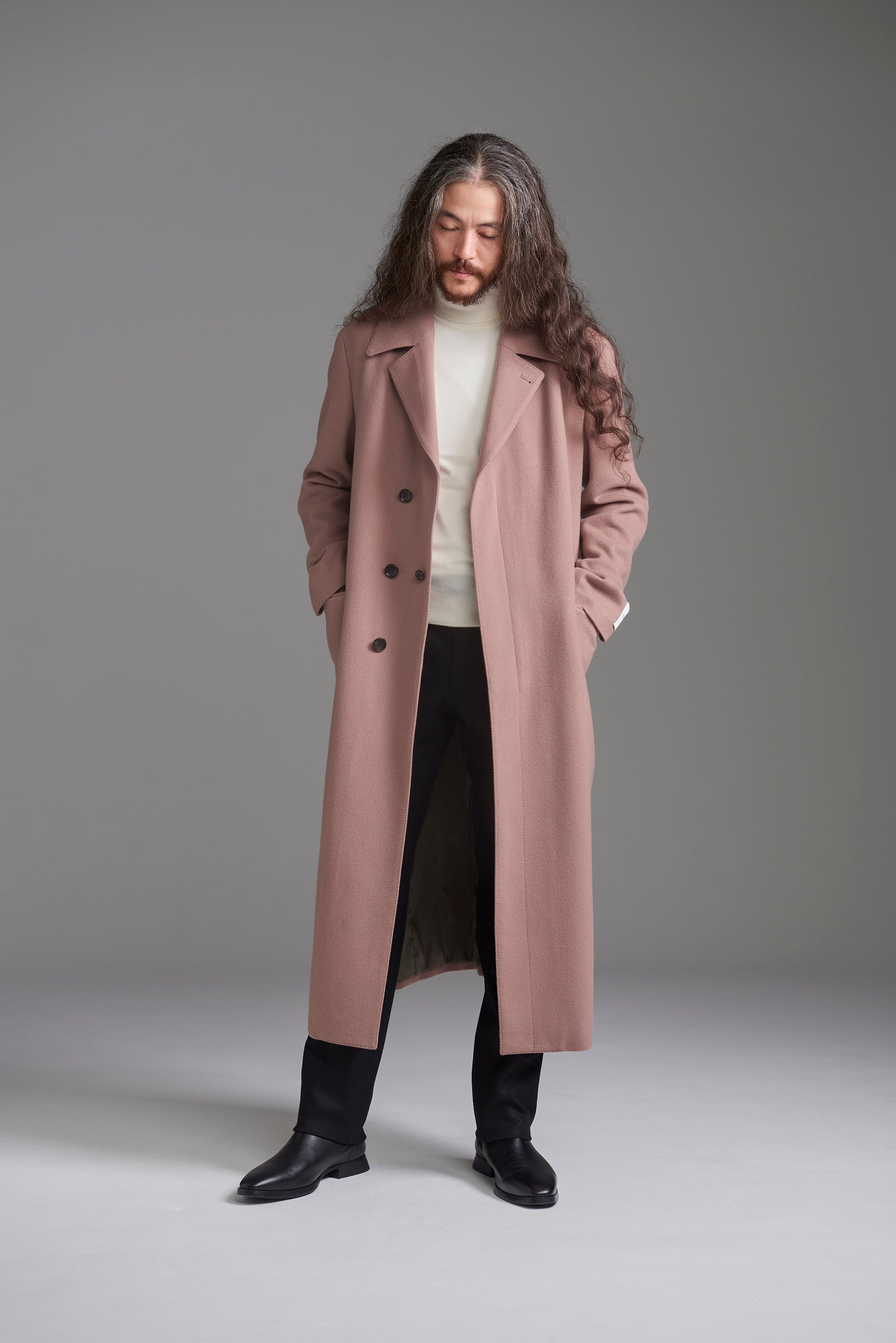 今期注目のくすみ感を楽しめる、柔らかな印象のピンク。秋冬生地らしい起毛感のある生地風合いもポイントです。レディースのようなカラーリングですが、コートのデザインが重みを感じるものになっているため、ちょっと力の抜けた、雰囲気のあるロングコートスタイルを楽しめます。