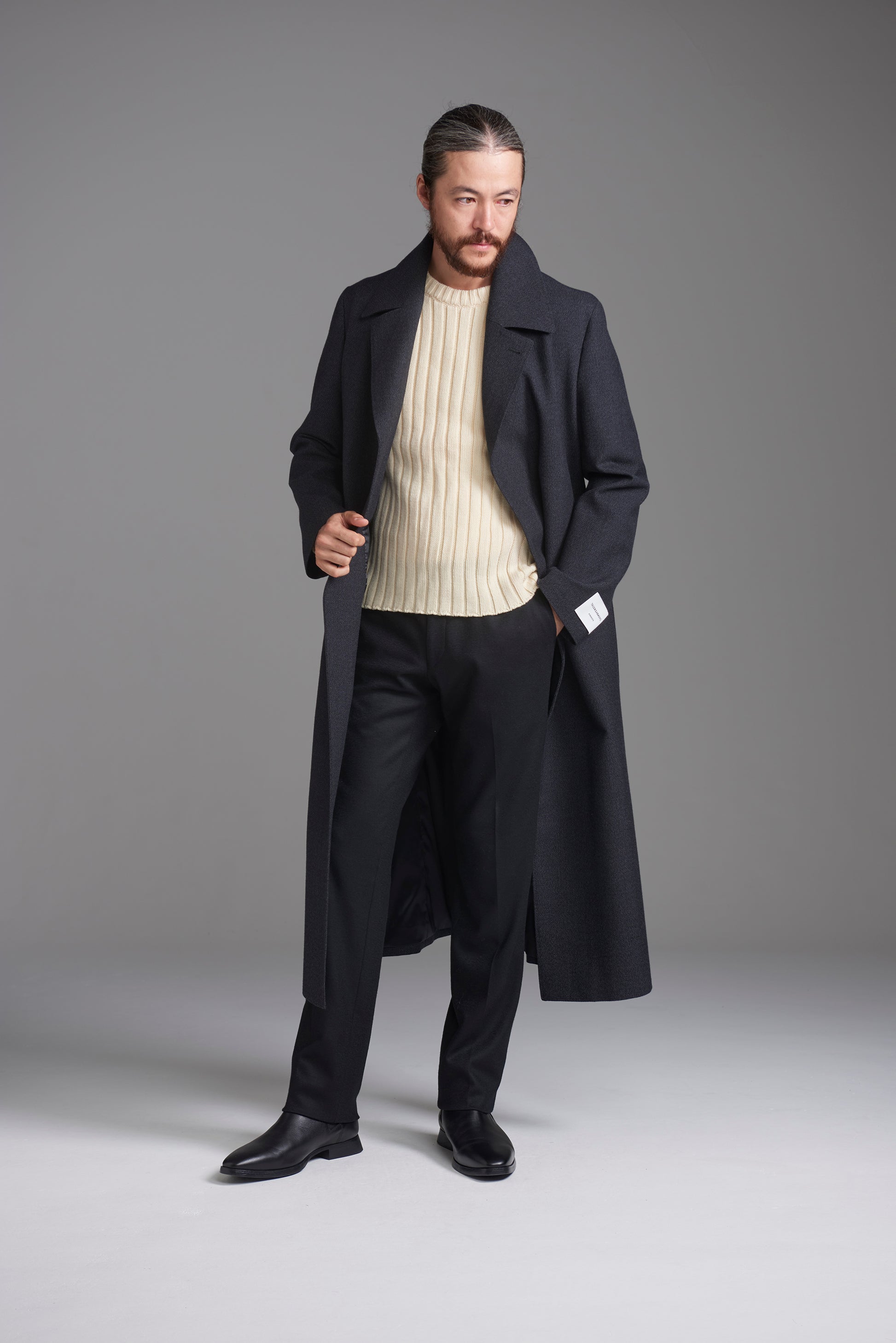 存在感のあるコートなので、甘く見えやすいローゲージニットコーデをビシッと引き締めるのも良いですし、しっかり見える生地感を活かしたビジネスコーデにもおすすめです。