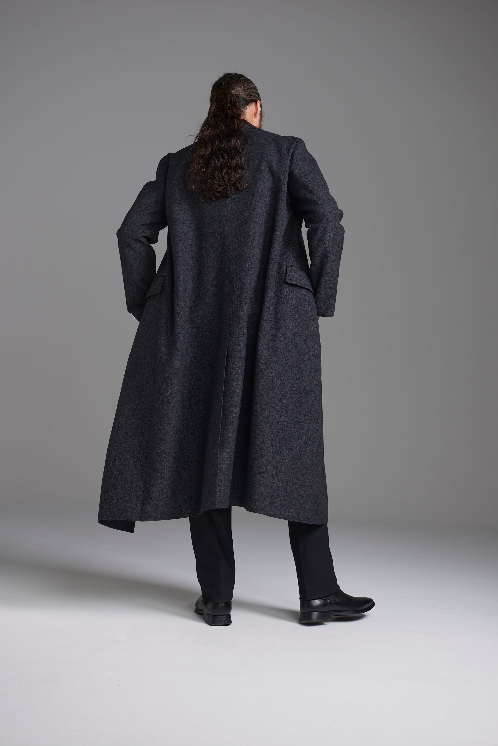 ボリュームとドレープ感が楽しめる、ロングの着丈のバルマカーンタイプのコートです。前合わせはシングルより深く、ダブルに近いデザイン。フロントのボリューム感も豊かです。