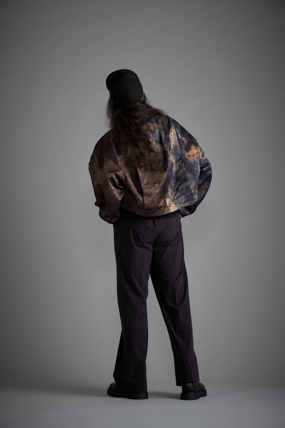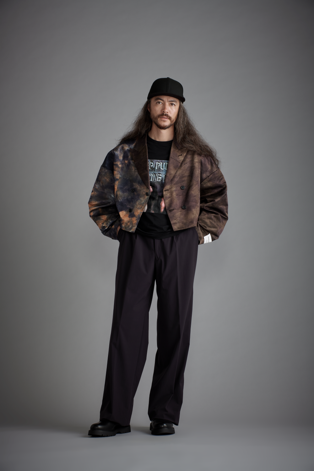 合わせ方によってはサイケデリックさやカジュアル感が強くなってしまうジャケットを、ドレス感のあるボトムで雰囲気をキープさせるイメージのコーディネートです。ボトムカラーはブラックですが素材や織りの特性上グレーがかった黒の見え方になるため、インナーにコットンのブラックなどを配しても黒の質感違いを見せることが可能。ジャケット以外をモノトーンでまとめることでもモダンな雰囲気をキープできるので、小物遣いなどもモノトーン配色のコーデがおすすめです。"