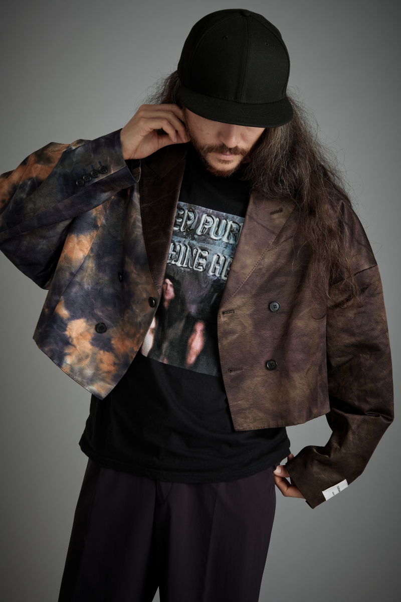 "左右のボディでカラーパターンを切り替えた、オーバーサイズのダブルジャケットです。特徴的なデザインはジャケットというよりブルゾン感覚でご使用いただけるものになっています。コットンをベースにレーヨンを混紡し、あえて不規則なシワが出るように仕上げた生地にタイダイのようなムラ感のある染色を施した生地を使用。左右切替えのインパクトも楽しめるデザインになっています。
