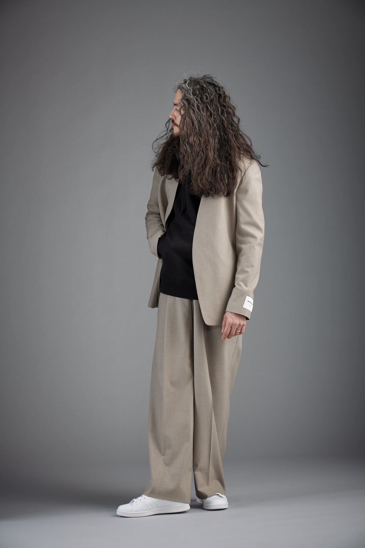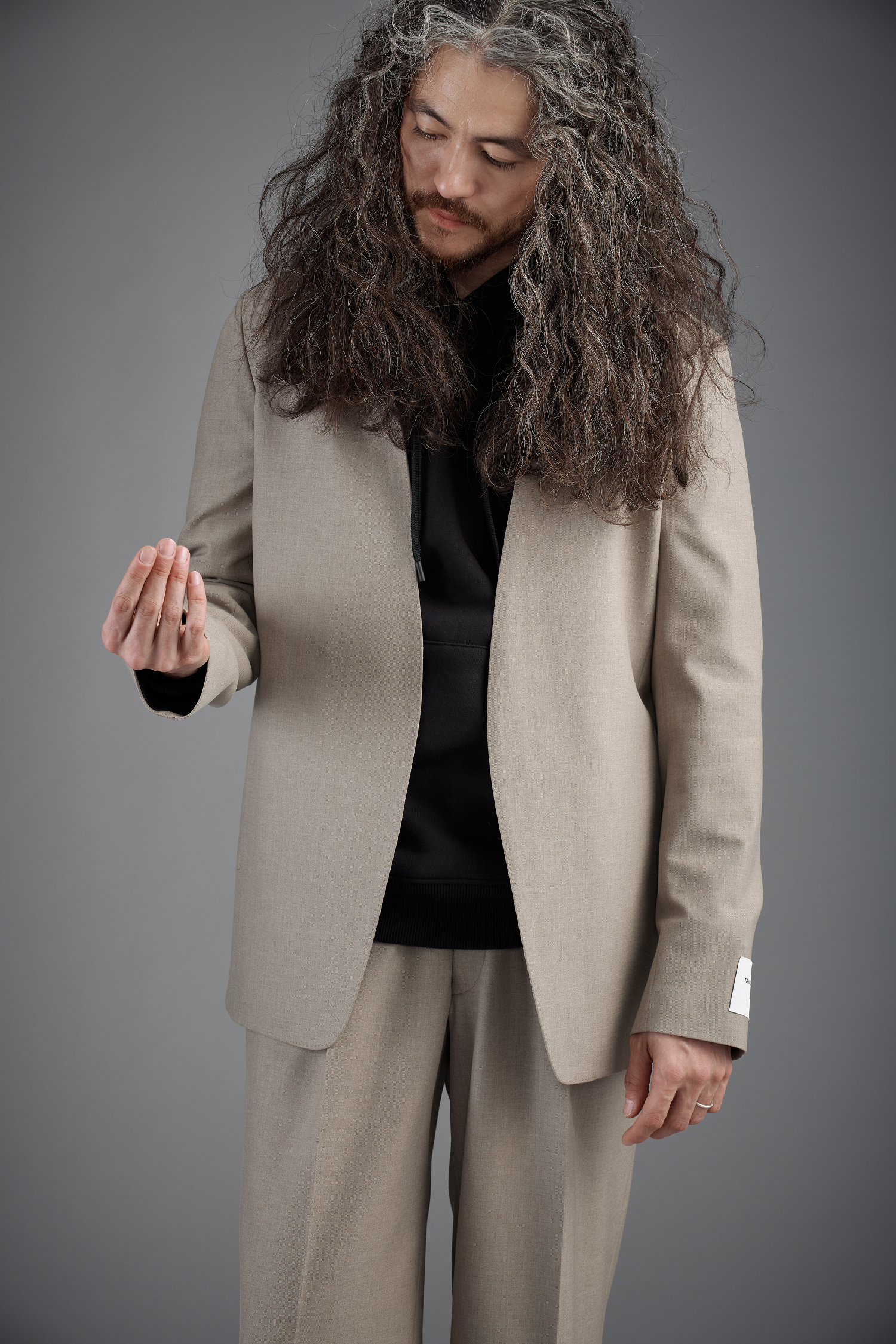 タテ・ヨコに伸縮性のある2wayストレッチ素材で、適度なハリ・コシがありシルエットを美しく見せてくれます。それに加えウール混による上質感も楽しめる、ハイスペックな生地。使用されているポリエステルは全てリサイクル原料というサスティナブルな点もポイントです。