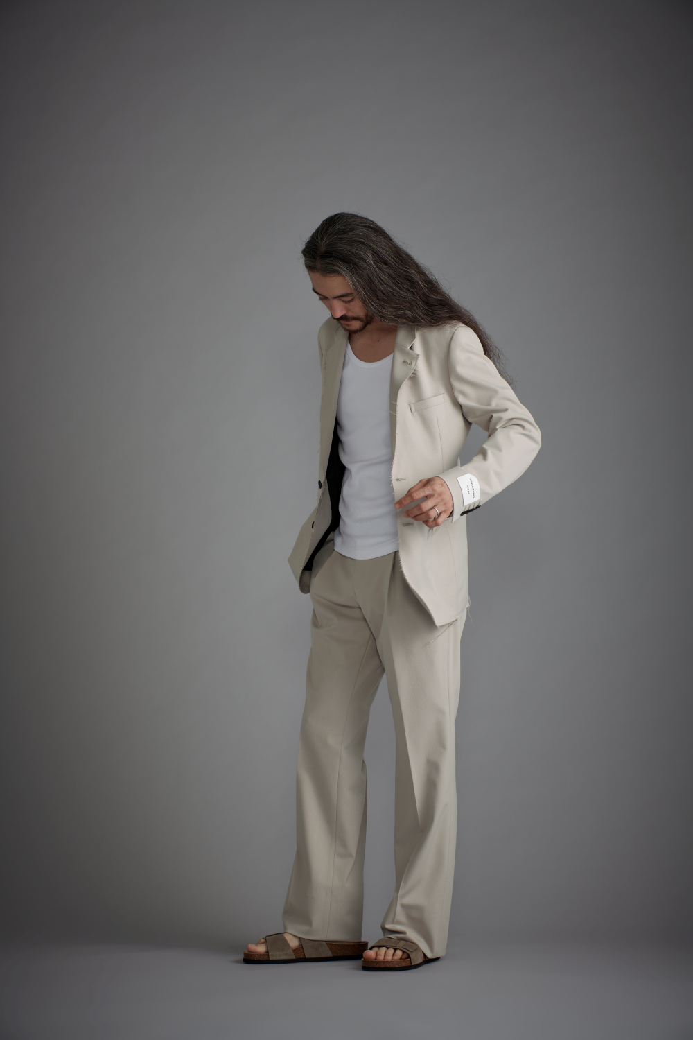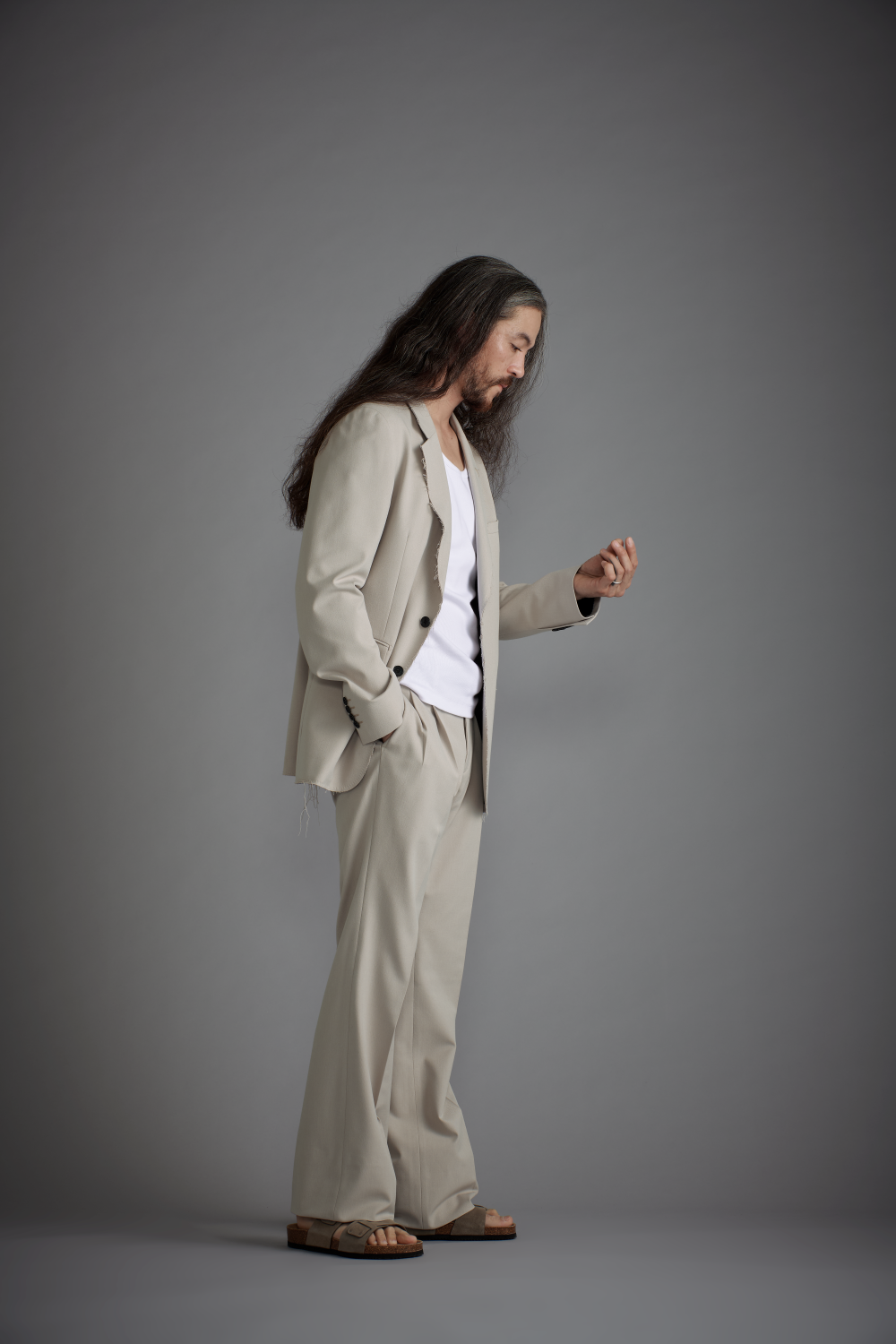 "ベーシックなウール調素材で仕立てたカットオフジャケットのセットアップ。 デニム生地などコットン素材で用いられる切りっぱなし(カットオフ)デザインを、敢えてウール調素材で。柔らかで上質な素材感とカットオフのラフさという、一着の中にもコントラストが効いたアイテムになっています。ボトムに選んだデザインはタック入りのバギーパンツ。ラフにも上品にも見えるジャケットのデザインを邪魔せず、セットアップとしての統一感が生まれる組み合わせとしてチョイスしました。 美しい色合いのライトグレージュカラーの生地はタテ・ヨコに伸縮性を持つ2wayストレッチ。着用時のストレスも軽減してくれます。"