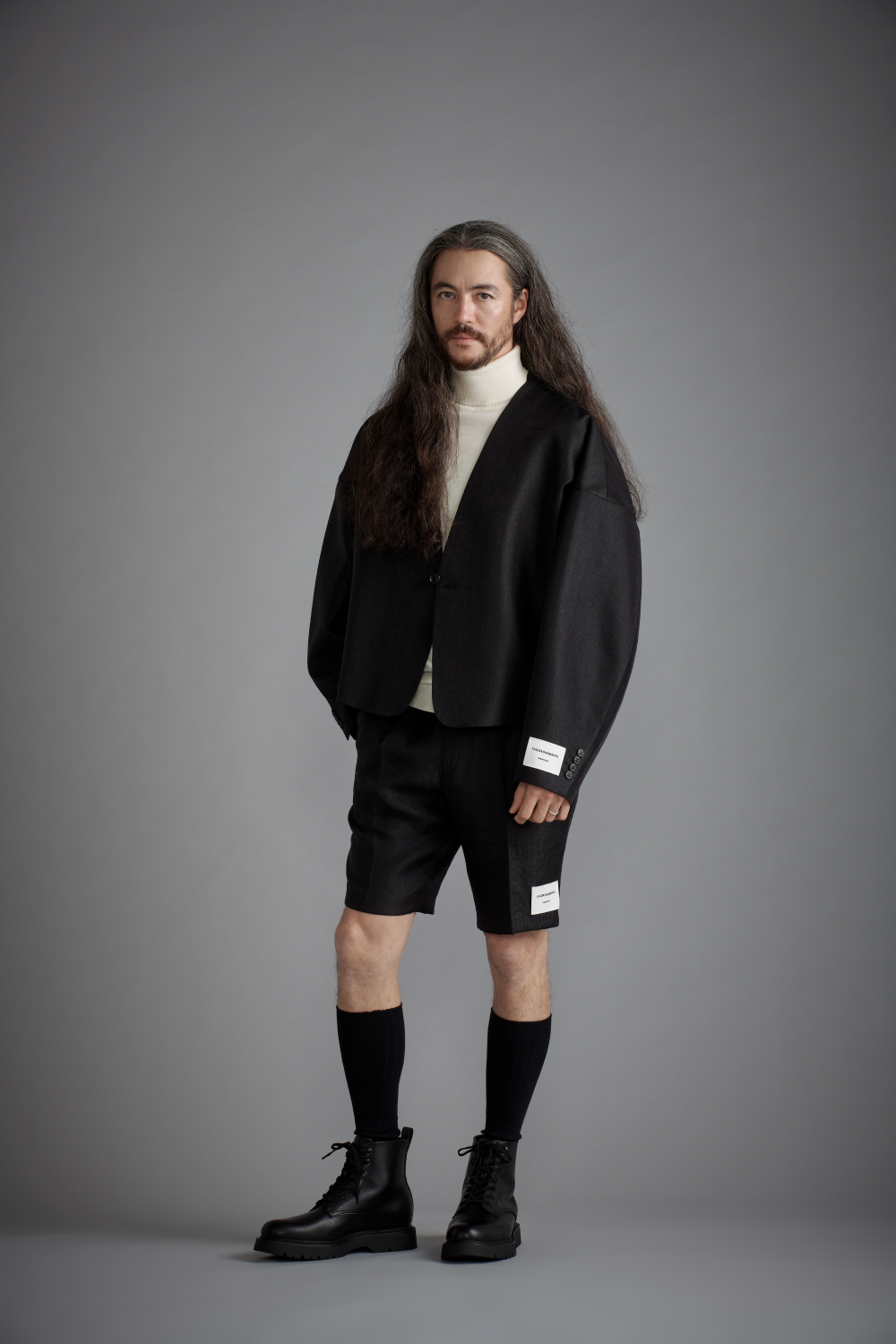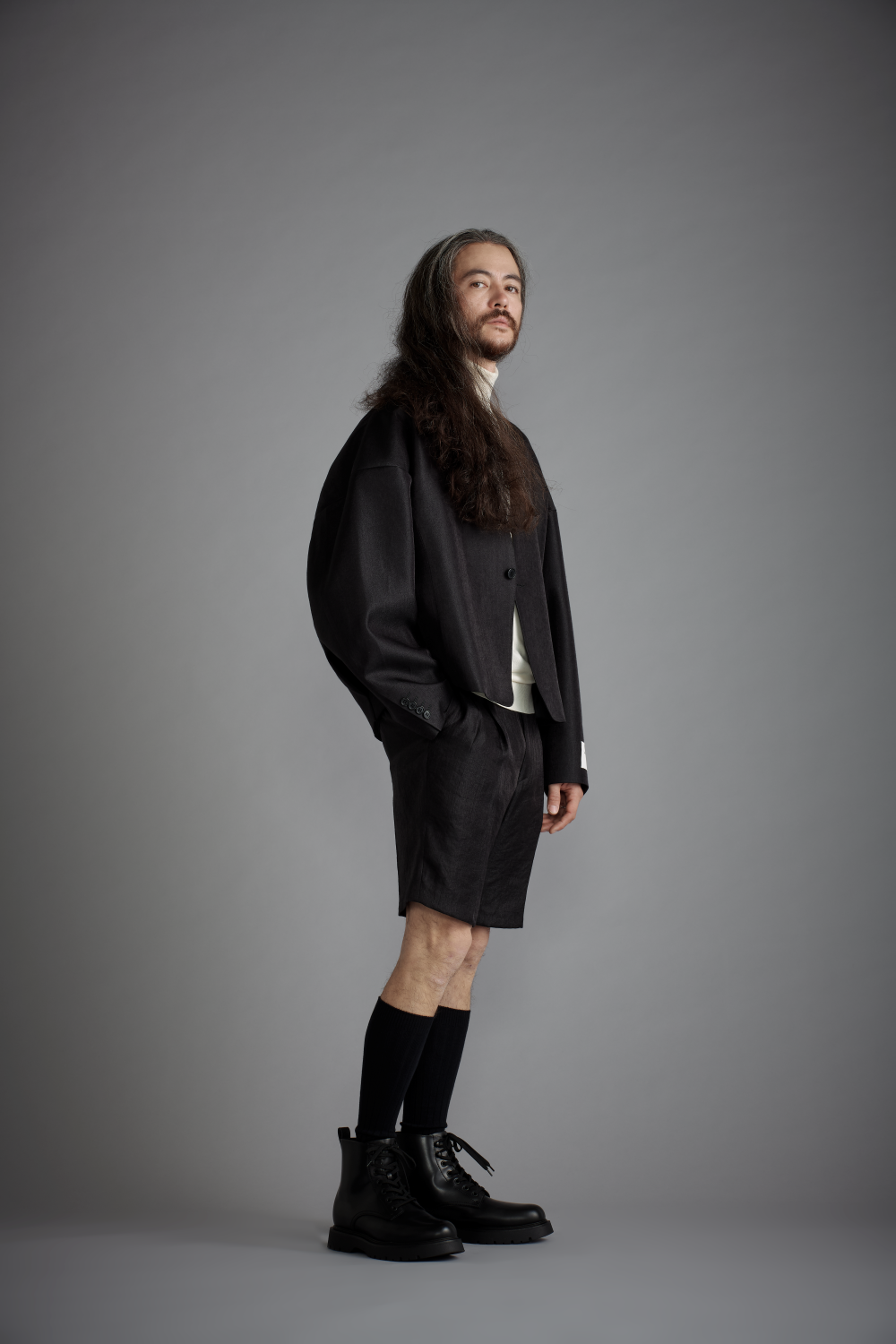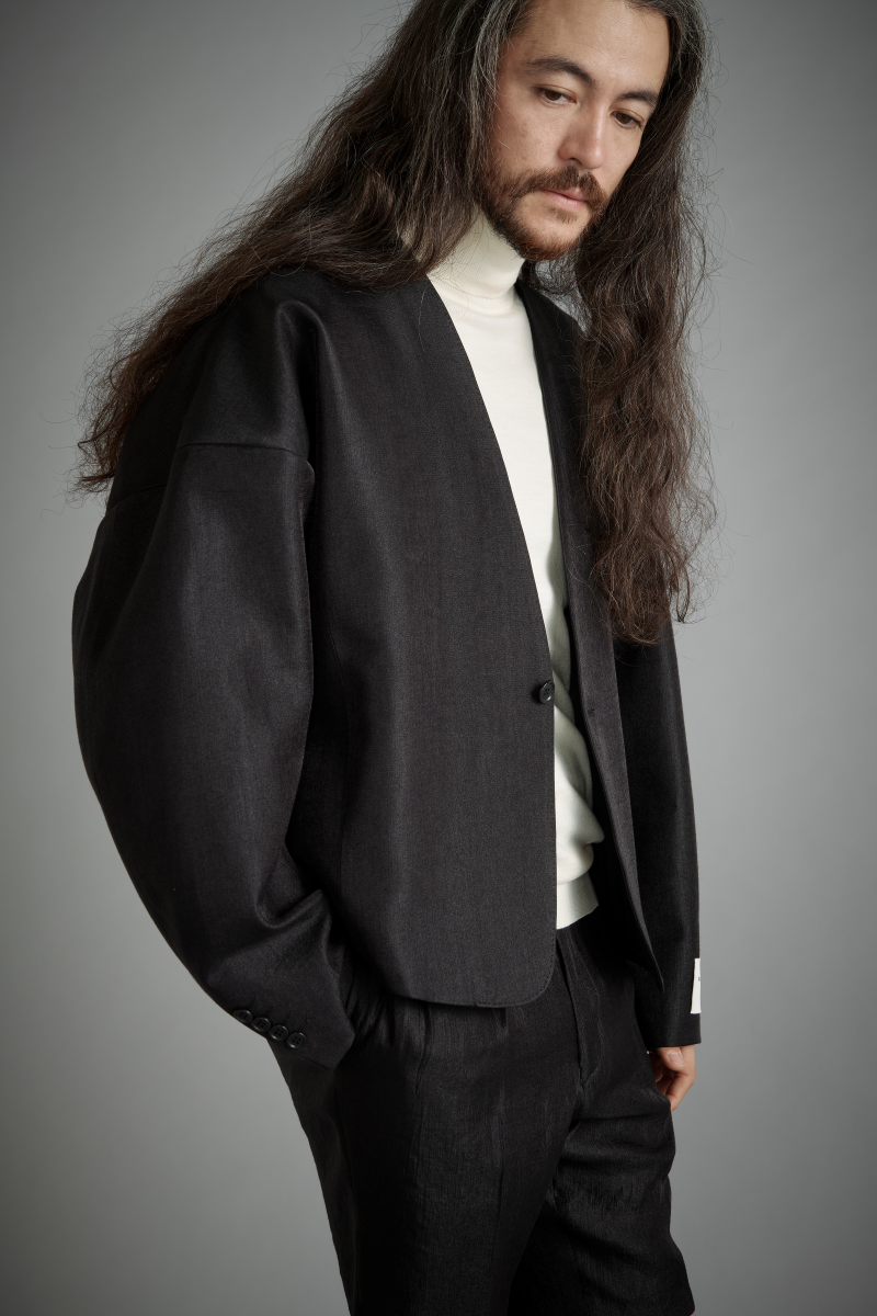 ""ナチュラルで優しいヴィンテージ感のある風合いと、キラキラとした上品な光沢が特長のサテン生地を使用したセットアップ。 ジャケットはテーラード仕立てならではのフロントの美しさのみならず、ドロップしたショルダー、たっぷりと幅と長さを取ったアーム、独特なデザインのバックスタイルと他にはないデザインが特長。ボトムはシンプルでドレッシーなラインのショーツをセットしています。 デザインが強調される、光沢感のあるブラックはモダンな雰囲気たっぷりです。落ち着いた印象のインナー・シューズだけではなく、トップのインナーにパーカーを使用したりボトムにレギンスを使用したりといったデザインで遊ぶようなコーディネートにもこちらのブラックは好相性。様々なコーディネートでスタイリングのジャンル自体がガラッと変わるような意外性も楽しんでください。" "